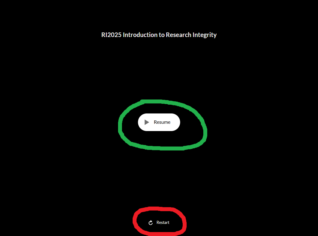 When resuming the course, always select ‘Resume’ (circled in green in image to the left) to continue from where you left off.